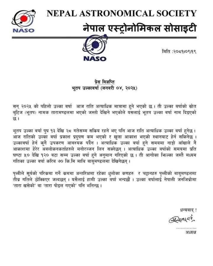 प्रविधिआज उल्कावर्षा हुने admin२०८१ पुष १९, शुक्रबार १५:३२ गते0 Comments3451 Min Read आज राति “तारा खसेको” हेर्न पाइनेछ । प्रति घण्टा ५० देखि १२० वटा सम्म “उल्कावर्षा हुने नासोले विज्ञप्ती मार्फत जनाएको छ । Share FacebookTwitterLinkedInPinterestStumbleuponEmail